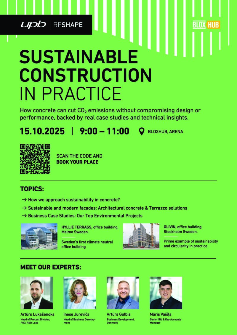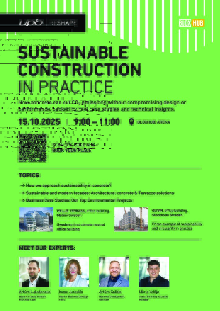 In this first edition, Latvian founded UPB will tell us how concrete can cut CO2 emissions (yes you heard it right, cut emissions!) without compromising design or performance. UPB will not just talk us through this but showcase built projects and insights.