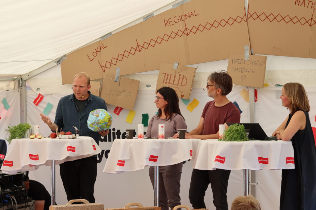 This events moderator is Jacob Rask, seen here in action at Folkemødet in 2024. Jacob is Director of the Regenerative Built Environment Network at BLOXHUB and former Economy Lecturer at Roskilde University, and founder of Copenhagen Doughnut.