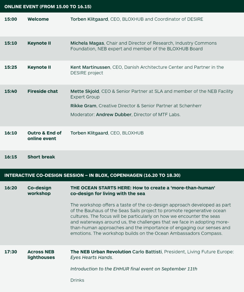 Meet experts, practitioners, and changemakers from the three New European Bauhaus Lighthouse projects; Designing the Irresistable Circular Society (Desire), Bauhaus of the Sea Sails (BoSS), and Eyes, Hearts, Hands Urban Revolution (EHHUR), be inspired and take part in shaping the future of NEB through cross-sector, cross-cultural dialogue.